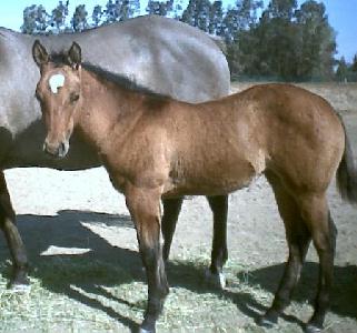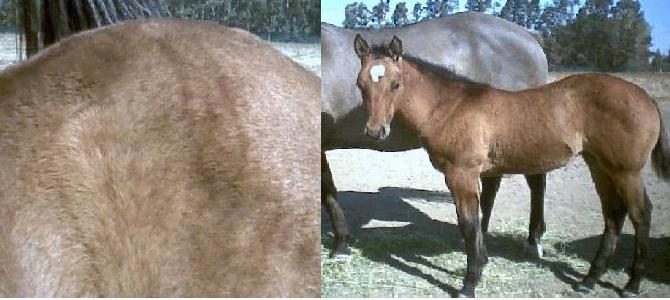 This 2003 Dun Filly is a carrier of the seasonal Brindle pattern. She is by the mahogany bay AQHA stallion Ima Star Brindle Bar, who is a carrier of the seasonal brindle pattern from his dam Im A Star Moon Bar. Ima Star Brindle Bar has reproduced the seasonal brindle pattern in his offspring even though he shows no visible striping himself. (For examples of crosses on non-brindle mares refer to the foals Shadow's One and Brindle Batty Atty).