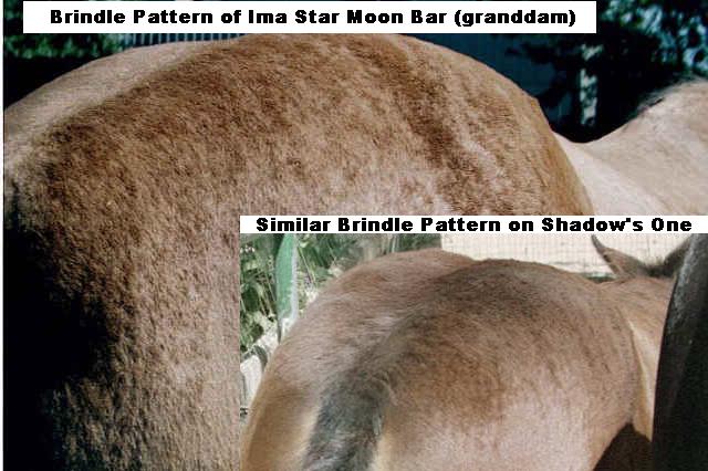 2B. His second foal that arrived in 2001, (Shadow's One), is a bay with the seasonal brindle pattern out of a non-brindled black mare (Brenda's Shadow). She is registered in the Half Quarter Registry (12501 1/2). This foal has the same seasonal brindle pattern as Star (his dam), indicating he is a carrier of Star's type of brindle pattern and is capable of passing it on, even though he is not visibly striped himself.