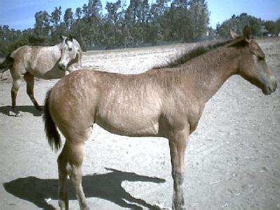 2E. His third foal in 2003 (Brindle Batty Atty) is out of a non-brindle mare (Going Batty Atty). She is registered in the AQHA (4393424) as a dun. She inherited the dun factor from her grullo dam, but she is also starting to exhibit the seasonal brindle pattern from her sire.