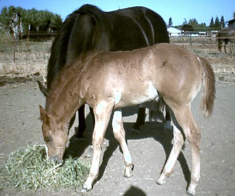 2C. He has sired three foals in 2003. The first is a red colt (Shadow's Red Man) out of the same non-brindled black mare (Brenda's Shadow) as Shadow's One above. He is registered in the Half Quarter Registry (12618 1/2). The colt exhibited indeterminate coat texturing as a foal, but it is too early to tell if he carries the seasonal brindle pattern. As with his sire, who also does not exhibit visible striping, we may have to wait until he is old enough to do test breedings to see if he is a carrier.