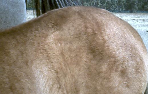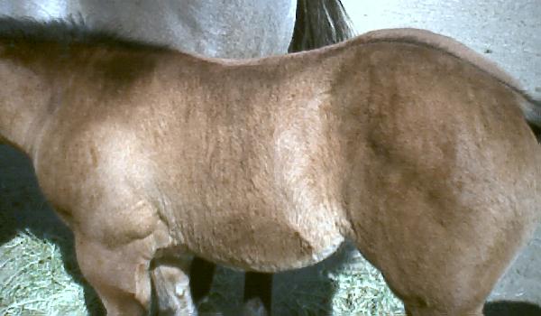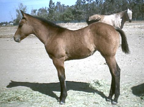 This 2003 Dun Filly is a carrier of the seasonal Brindle pattern. She is by the mahogany bay AQHA stallion Ima Star Brindle Bar, who is a carrier of the seasonal brindle pattern from his dam Im A Star Moon Bar. Ima Star Brindle Bar has reproduced the seasonal brindle pattern in his offspring even though he shows no visible striping himself. (For examples of crosses on non-brindle mares refer to the foals Shadow's One and Brindle Batty Atty).