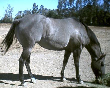This 1995 Grullo Mare is a carrier of the seasonal Brindle pattern. She out of the buckskin brindle AQHA mare Im A Star Moon Bar, who is a carrier of the seasonal brindle pattern and is one of the foundation mares of one line of Brindles I have studied. Im A Star Moon Bar has reproduced the seasonal brindle pattern in her offspring. Refer to the article on her offspring.
