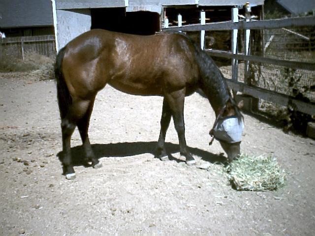 This 2001 Bay Filly is a carrier of the seasonal Brindle pattern. She is out of Brenda's Shadow, a daughter of the Brindle mare Brenda Batty Atty, and is by the mahogany bay AQHA stallion Ima Star Brindle Bar, who is a carrier of the seasonal Brindle pattern from his dam Im A Star Moon Bar. Ima Star Brindle Bar has reproduced the seasonal brindle pattern in his offspring even though he shows no visible striping himself. (For examples of crosses on non-brindle mares refer to the foals Shadow's One and Brindle Batty Atty).