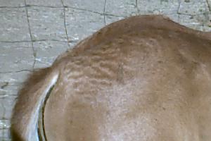 Indeterminate Foal Coat texturing on Shadow's Red Man. Many foals, even non-brindles, will exhibit some sort of coat texturing which will usually disappear as they get older.
