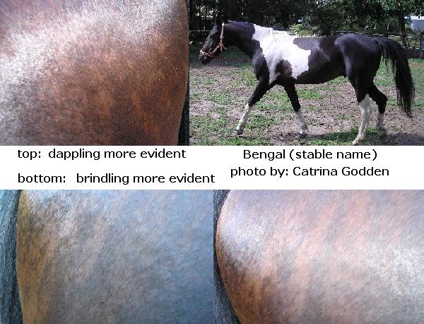 Below is pictured another horse that also seems to have both dappling and brindling. His stable name is Bengal, and he is a Standardbred from Australia owned by Catrina Godden.