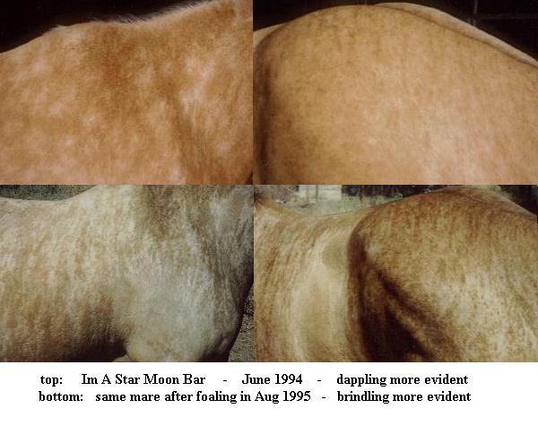 The different hair lengths in dappling is interesting. Other patterns, such as Appaloosa patterns, Paint/Pinto spotting, and brindle striping, also show various forms of coat texturing. While most of my Brindle horses did not show any dappling, I did have one line of brindles from a brindled buckskin mare (Im A Star Moon Bar) that also had dappling. I classified her brindle pattern as "seasonal" brindle because at certain times of the year, generally spring and fall, it was more visible than at other times. She also appeared much more brindled during the time she was lactating after foaling (spring, summer, and fall).