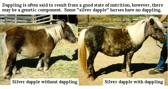 It has also been said dappling indicates a state of good condition or good nutrition. It may well be that good nutrition has an influence in the expression of dappling. However, it doesn't explain why dappling seems to run in some families and not in others, and why dappling shows seasonal and yearly variations in horses that are well fed and in a constant state of good nutrition.