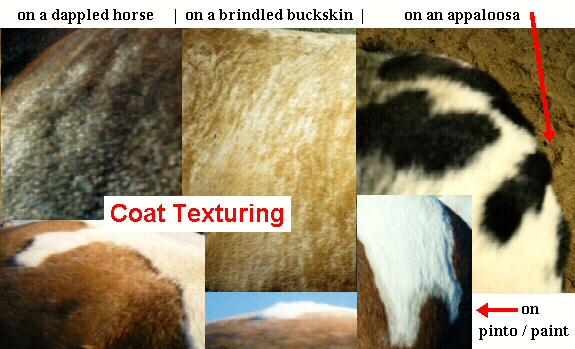 Many patterns, such as dappling, appaloosa spotting, paint/pinto spotting, brindle striping, and dun factor markings, are also accompanied by various forms of coat texturing.